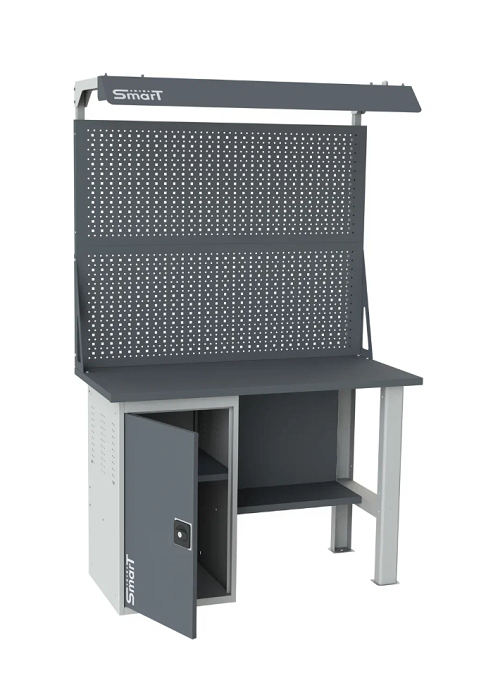 Дополнительно на верстак можно установить: тумбу-пенал SMART, ящик подвесной SMART, тумбы SMART с выдвижными ящиками, панель перфорированную (экран) SMART, комплект освещения SMART, аксессуары на экран SMART, возможна установка системы мастер ключ.