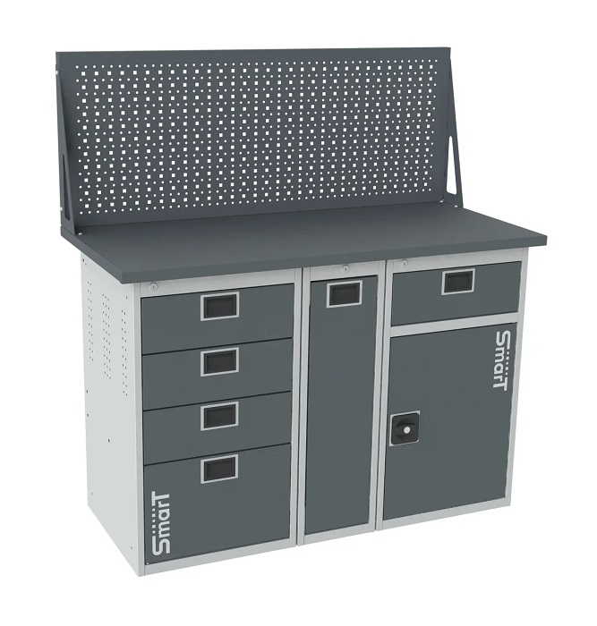 В комплектацию верстака входит: столешница 1280 SMART, тумба SMART 1-1, тумба SMART 4, тумба-пенал SMART, одна перфорированная панель (экран) SMART. Столешница выполнена из фанеры 27 мм со стальной окрашенной накладкой 1,2 мм. Тумба SMART 1-1 комплектуется одной дверью, одним выдвижным ящиком и одной полкой. Возможна смена стороны открывания двери тумбы. Внутренняя стенка двери имеет универсальную перфорацию для размещения навесных элементов. Тумба SMART 4 комплектуется 4 выдвижными ящиками. Выдвижные ящики оборудованы телескопической системой полного выдвижения ящиков с фиксацией в закрытом состоянии (50000 циклов). Тумба-пенал SMART выдвигается на четырех телескопических направляющих и предназначена для хранения крупногабаритных инструментов и аксессуаров. Все тумбы закрываются ключевым цилиндровым замком. Секретность замка 2000 комбинаций (2 ключа в комплекте). Перфорированный экран SMART имеет универсальную перфорацию для размещения различного типа крючков и держателей инструмента. Шаг квадратной перфорации (10 мм) - 38х38 мм, круглой (7 мм) - 25х38 мм. Цвет верстака: корпус тумб - серый Ral 7035, столешница, лицевая панель тумб - графит Ral 7016. Поставляется в разобранном виде.