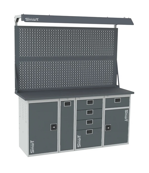 Дополнительно на верстак можно установить: аксессуары на экран SMART, подвесной ящик Smart, поменять вид тумб, а также возможна установка системы мастер ключ
