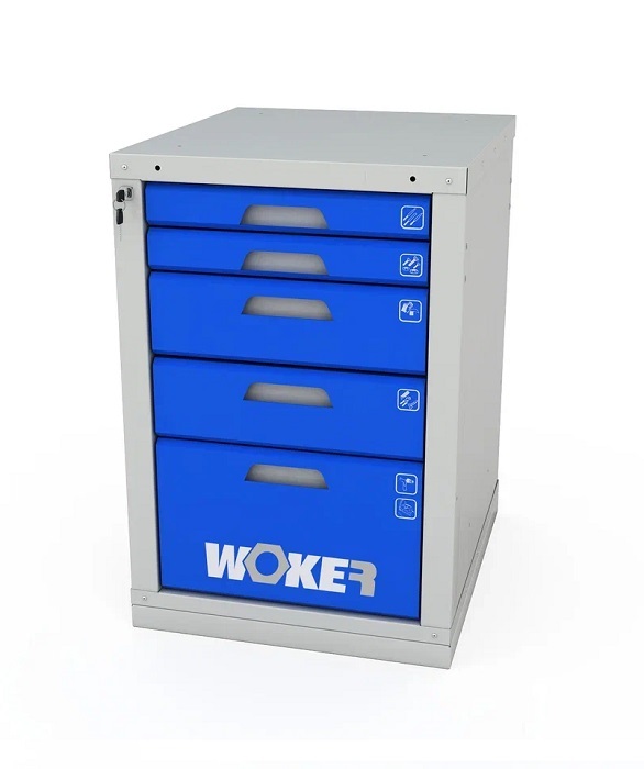 В комплектацию верстака входит: столешница Woker 1500, одна тумба Woker 02, одна тумба Woker 05. Столешница выполнена из шлифованной березовой многослойной фанеры толщиной 30 мм. Снаружи фанера обработана влагостойким антисептиком цвета "красное дерево", что придает фанере повышенную влагостойкость и более темный цвет. Тумба Woker 02 имеет одну регулируемую по высоте полку (шаг 50 мм). Полка тумбы установлены на стальные салазки, которые позволяют выдвигать полку на себя на 70% для облегчения разгрузки/погрузки. Дверь тумбы закрывается на цилиндрический замок со стальной поворотной ручкой, секретность замка 2000 комбинаций. Открывание двери на 180 градусов. Тумба Woker 05 комплектуется 5 выдвижными ящиками (2 высотой - 135 мм, 2 высотой - 65 и 1 высотой - 275 мм). Полезный размер ящика: (ШхГ) 459х612 мм. В ящиках есть противоскользящие коврики и набор наклеек с пиктограммами для маркировки содержимого.