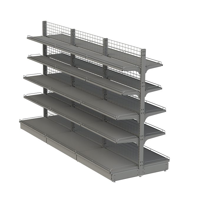 Островной стеллаж с сетчатой стенкой предназначен для продажи продовольственных и непродовольственных товаров. Относится к основным стеллажам, которые используются в супермаркетах и магазинах самообслуживания.