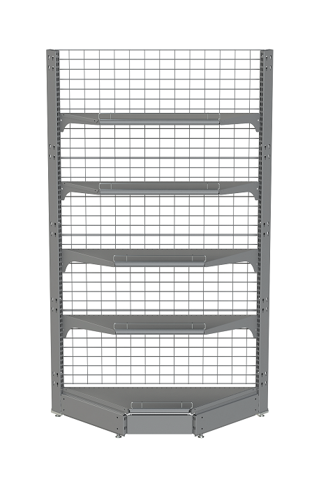 Стеллаж сетчатый угла внутреннего помогает полностью задействовать торговое пространство и продолжить целостность ряда пристенных стеллажей при наличии поворотов и колонн в торговом помещении. Актуален для большинства продуктовых, бытовых и хозяйственных помещений.